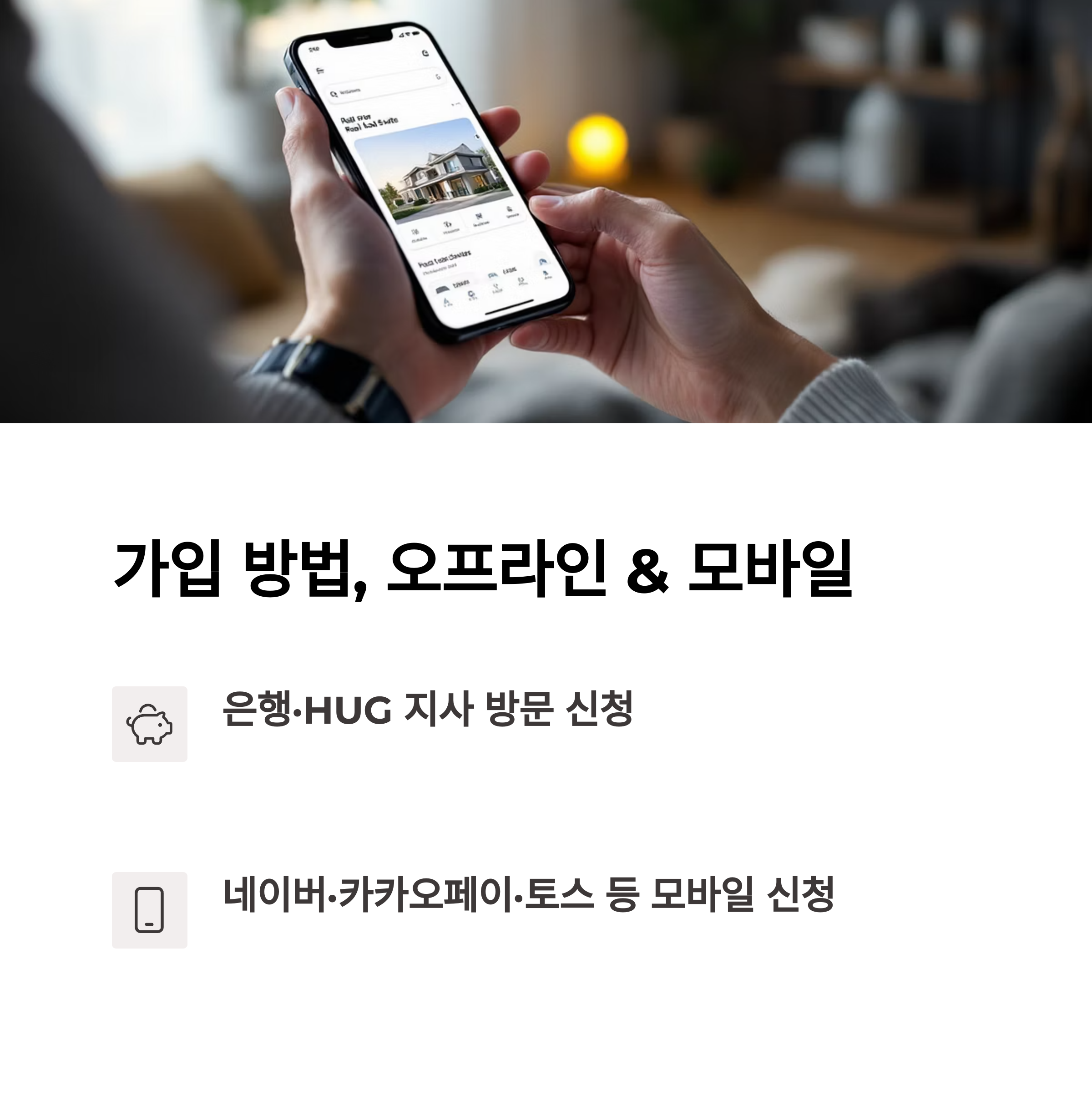 오프라인으로는 위탁은행(신한, 국민, 우리, NH농협 등) 또는 HUG 지사를 통해 신청 가능합니다.